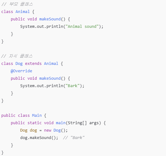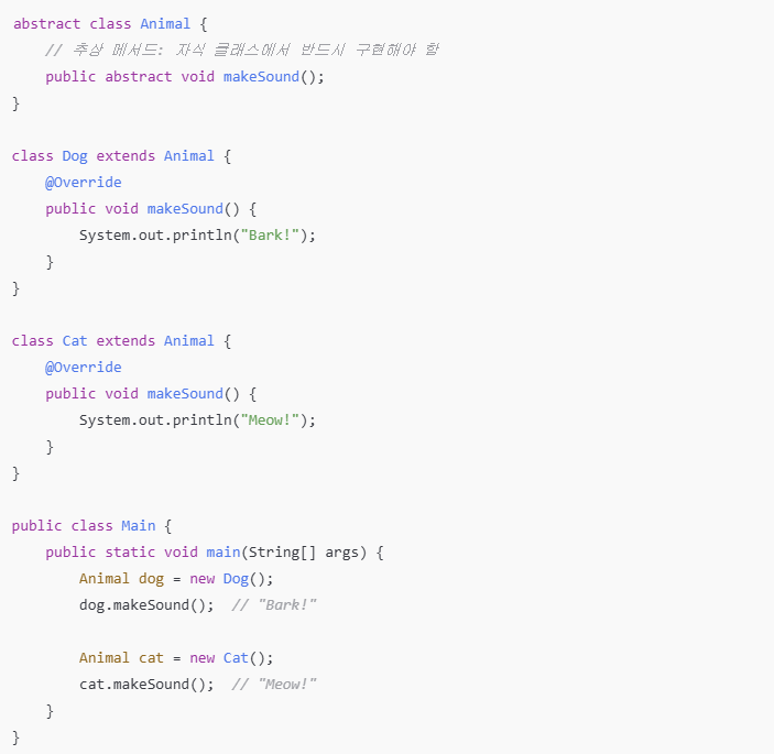 Dog,Cat이라는 클래스는 Animal이라는 부모 클래스에서 makeSound라는 동일한 메서드를 부여 받았습니다. 하지만