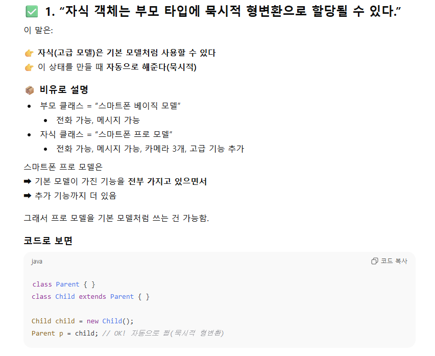 - 자식 객체는 부모 타입에 묵시적 형변환을 통해 할당될 수 있다.