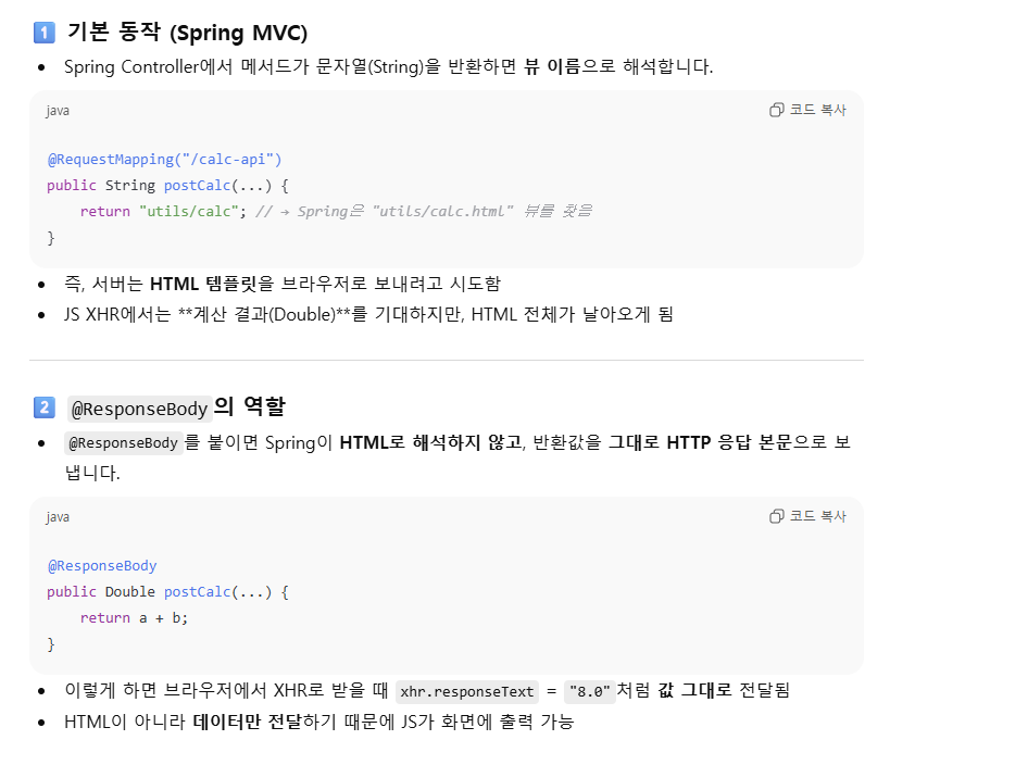 - @ResponseBody (메서드) : 해당 메서드의 반환 타입이 문자열 string 일 때, 템플릿을 뷰(view) 처리하는 것이 아닌, 문자열 그대로가 응답으로 반환되어야 함을 지정한다.