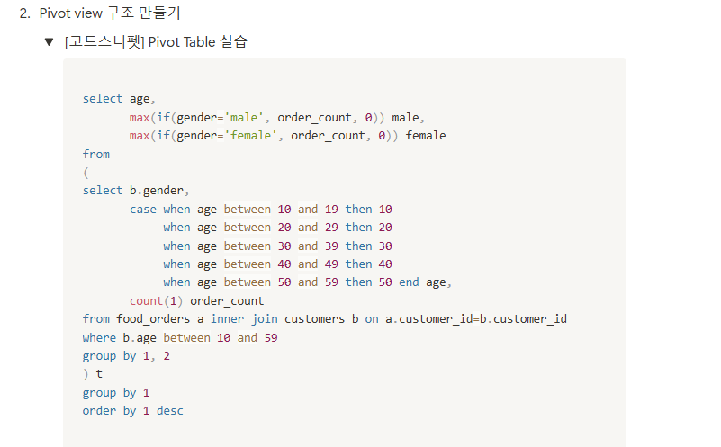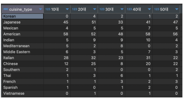 음식타입별, 연령별이니까 그룹 바이는 1,2로 서브쿼리 닫기.